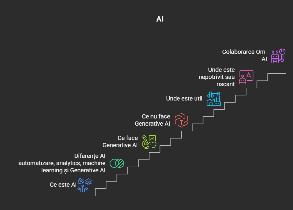 Acesta este motivul pentru care primul modul nu este o introducere formală, ci o fundație de lucru. Înainte să vorbim despre prompting, despre AI ca expert virtual, despre accelerare de cod, despre RAG (Retrieval-Augmented Generation), fine-tuning, agenți sau guvernanță, trebuie să răspundem clar la câteva întrebări esențiale: